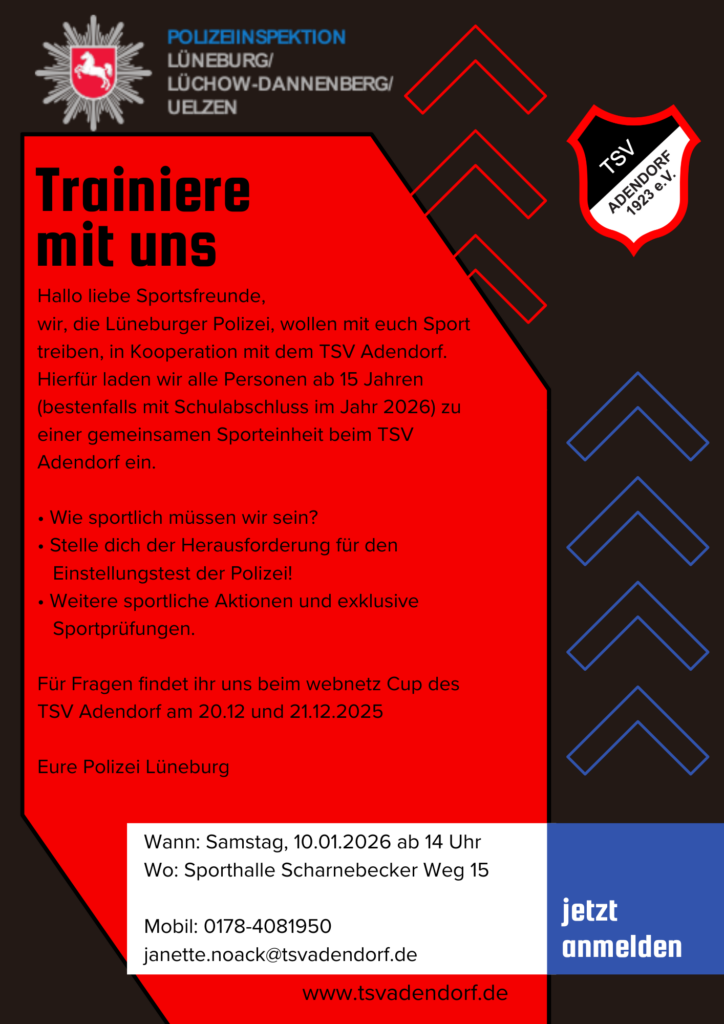 Praxisnahes Training mit der Polizei Kalender Zum Kalender hinzufügen Zu Timely-Kalender hinzufügen Zu Google hinzufügen Zu Outlook hinzufügen Zu Apple-Kalender hinzufügen Einem anderen Kalender hinzufügen Als XML exportieren Wann: 10. Januar 2026 um 14:00 – 15:30 2026-01-10T14:00:00+01:00 2026-01-10T15:30:00+01:00 Wo: TSV Adendorf Scharnebecker Weg 15 21365 Adendorf Deutschland Preis: Kostenlos Kontakt: Janette Noack 0178-4081950 E-Mail Allgemein