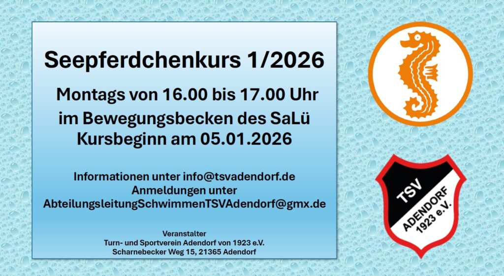 Seepferdchenkurs 2026 Kalender Zum Kalender hinzufügen Zu Timely-Kalender hinzufügen Zu Google hinzufügen Zu Outlook hinzufügen Zu Apple-Kalender hinzufügen Einem anderen Kalender hinzufügen Als XML exportieren Wann: 5. Januar 2026 um 11:17 – 12:17 2026-01-05T11:17:00+01:00 2026-01-05T12:17:00+01:00 Schwimmen Seepferdchenkurs Infos & Anmeldung