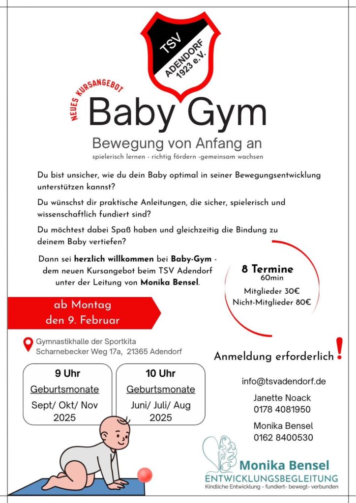 ✨ Baby Gym Bewegung von Anfang an. Wann: ab Montag 09.02.2026 , 9-10 Uhr und 10-11 Uhr Wo: Neue Gymnastikhalle, Scharnebeckerweg 17a Anmeldung: Monika Bensel 0162-8400530