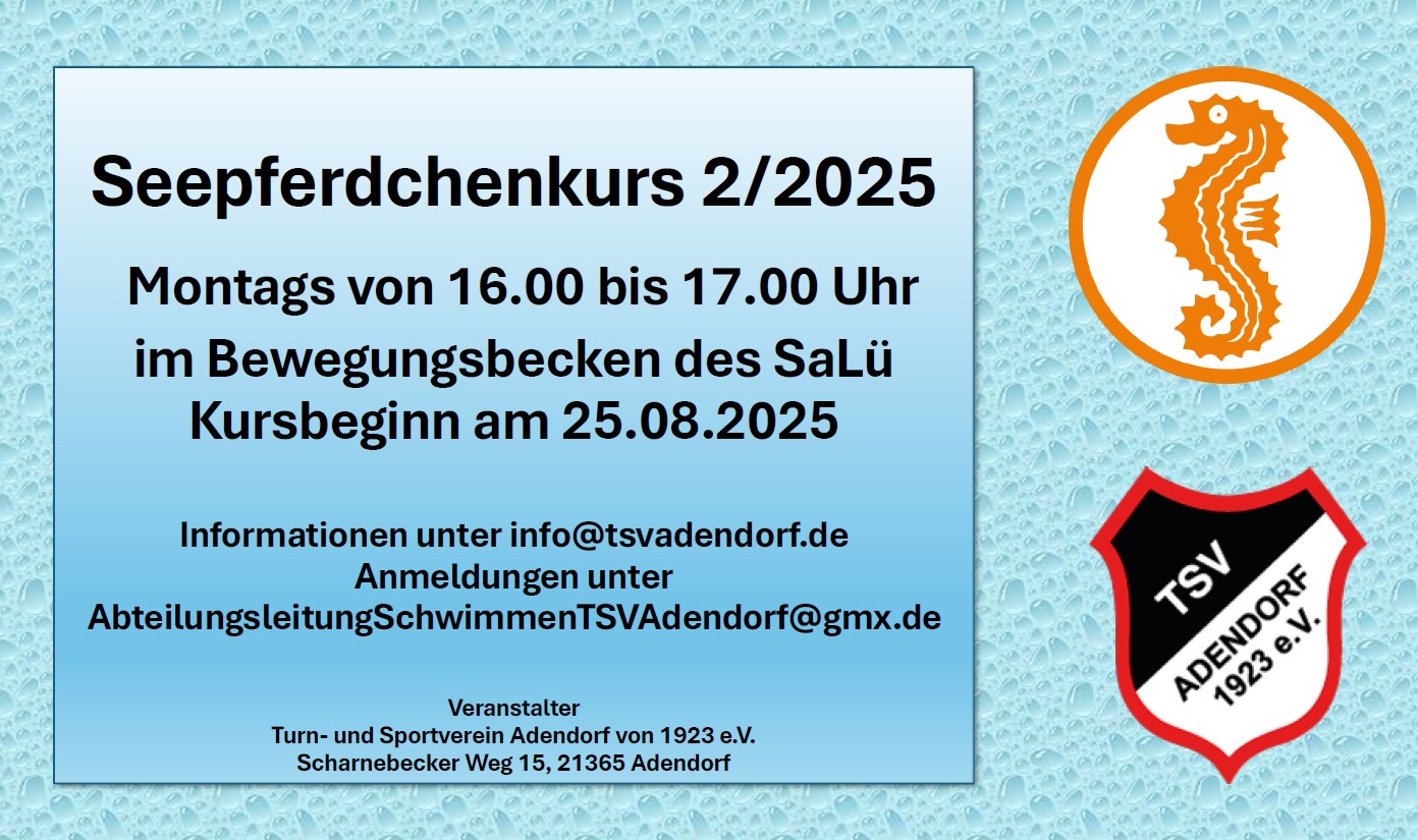 « Alle Veranstaltungen Diese Veranstaltung hat bereits stattgefunden. Neuer Seepferdchenkurs 2/2025 25. August 2025 $150 « Fackellauf TSV Adendorf 10 Jahre Team Bananenflanke – Jubiläumsturnier am 13. September » Flyer_Seepferdchenkurs 02-2025 Seepferdchenkurs 02-2025 Zum Kalender hinzufügen Google Kalender iCalendar Outlook 365 Outlook Live Details Datum: 25. August 2025 Eintritt: $150 Veranstaltungskategorien: Allgemein, Schwimmen Veranstaltungsort Sportbad Lüneburg Uelzener Str. 1, 21335 Lüneburg, Deutschland Lüneburg, Niedersachsen 21335 Deutschland Veranstalter Ralf Stenzel E-Mail: AbteilungsleitungSchwimmenTSVAdendorf@gmx.de