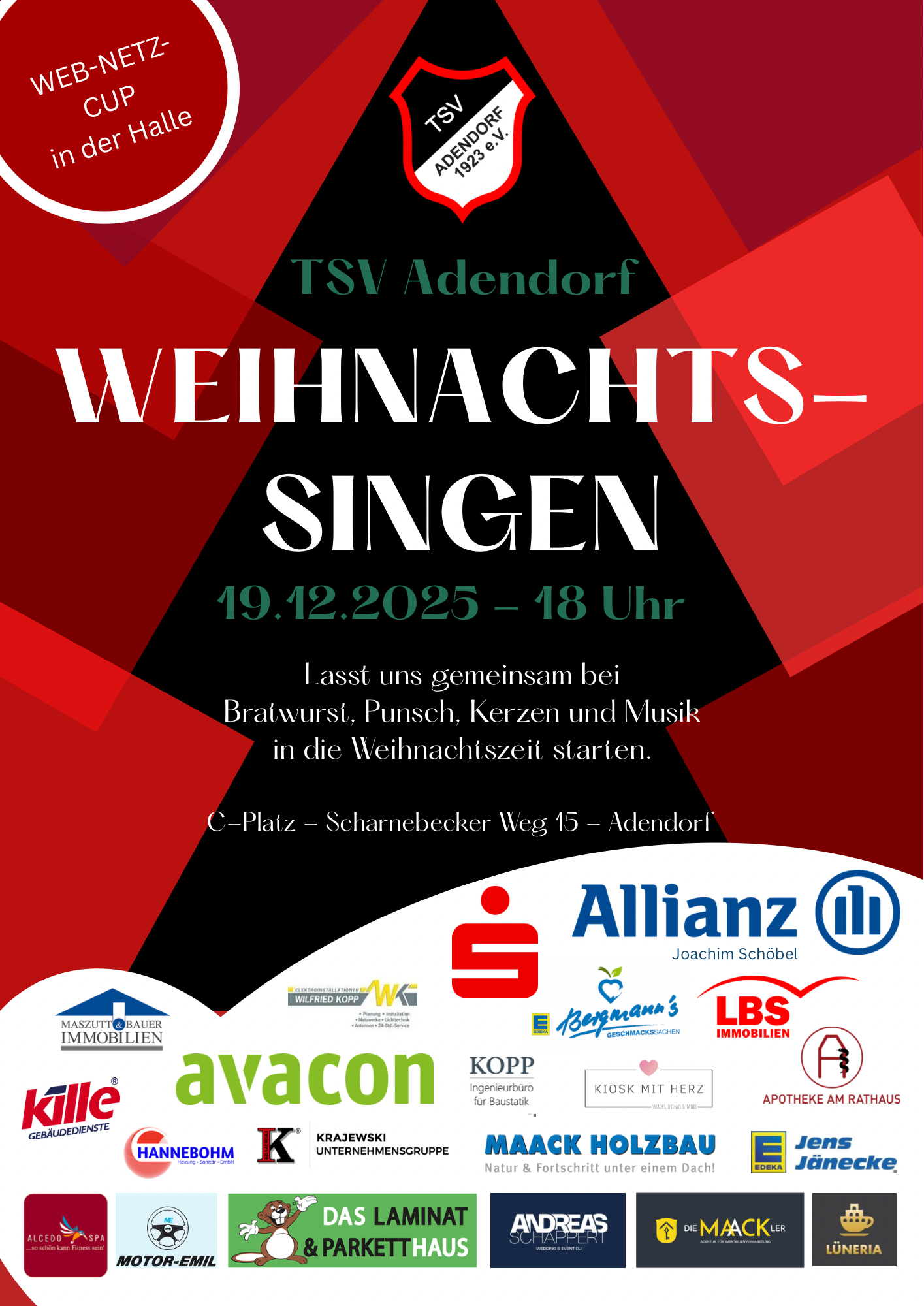 « Alle Veranstaltungen Diese Veranstaltung hat bereits stattgefunden. Weihnachtssingen 2025 19. Dezember 2025 @ 18:00 - 21:00 « Webnetz Cup beim TSV Seepferdchenkurs 2026 » Zum Kalender hinzufügen Google Kalender iCalendar Outlook 365 Outlook Live Details Datum: 19. Dezember 2025 Zeit: 18:00 - 21:00 Veranstaltungskategorie: Allgemein Veranstaltungsort TSV Adendorf Scharnebecker Weg 15, 21365 Adendorf, Deutschland Adendorf, Niedersachsen 21365 Deutschland Veranstalter Anja Scheffer Telefon: 015259432360 E-Mail: anja.scheffer@tsvadendorf.de